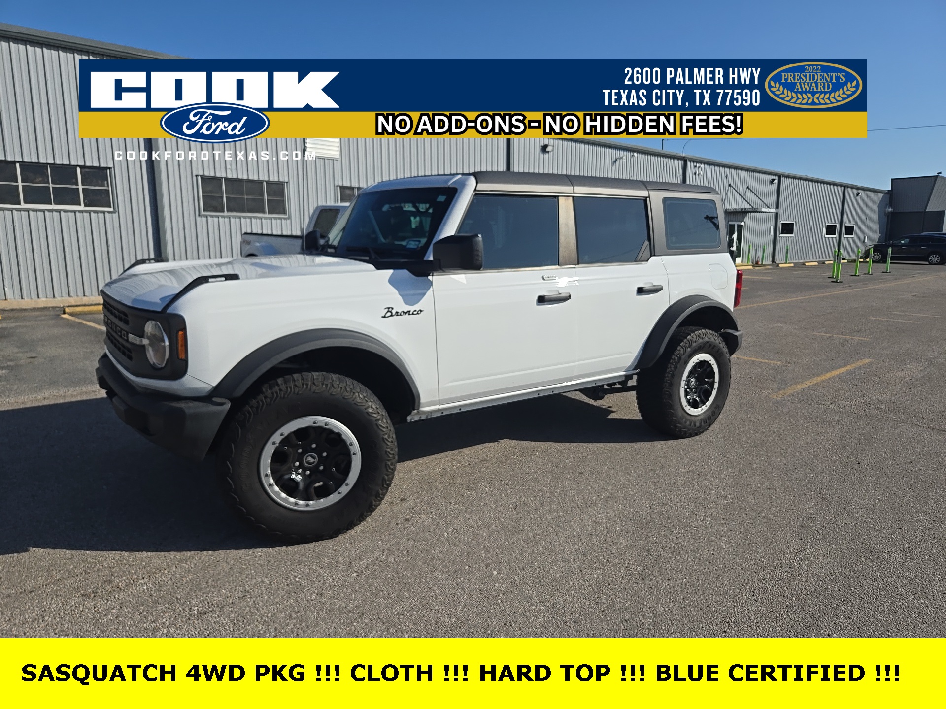 Certified. White 2023 Ford Bronco SASQUATCH 4WD 10-Speed Automatic 2.7L EcoBoost® V6 4.7 Final Drive Ratio, Equipment Group 101A Standard Package, High Clearance Fender Flares, High Clearance Suspension, Position-Sensitive Bilstein Shock Absorbers, Sasquatch Package, Wheels: 17″ Black High Gloss-Painted Aluminum.