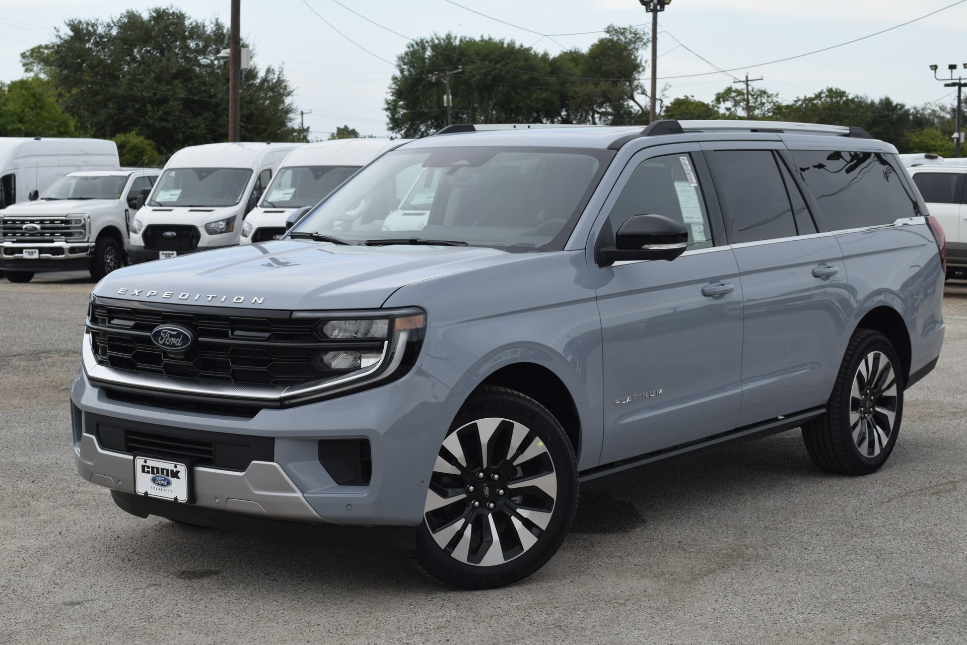 This 2025 Ford Expedition Max Platinum in Glacier Gray Metallic Tricoat comes with the following features: EcoBoost® 3.5L V6 GTDi DOHC 24V Twin Turbocharged 10-Speed Automatic 4WD Driver’s Package (Continuous Control Damping Suspension, Radio: B&O Unleashed Sound System by Bang & Olufsen, and SiriusXM w/360L), 10 Speakers, 2nd Row Power-Folding Captain’s Chairs, 3.73 Axle Ratio, 3rd Row seats: split-bench, 4-Wheel Disc Brakes, ABS brakes, Adjustable pedals, Air Conditioning, Alloy wheels, AM/FM radio: SiriusXM with 360L, Apple CarPlay/Android Auto, Auto High-beam Headlights, Auto-dimming door mirrors, Auto-dimming Rear-View mirror, Automatic temperature control, BlueCruise Equipped (1-Year Plan), Brake assist, Bumpers: body-color, Compass, Delay-off headlights, Driver door bin, Driver vanity mirror, Dual front impact airbags, Dual front side impact airbags, Electronic Stability Control, Emergency communication system: 911 Assist, Exterior Parking Camera Rear, Four wheel independent suspension, Front anti-roll bar, Front Bucket Seats, Front Center Armrest, Front dual zone A/C, Front reading lights, Fully automatic headlights, Garage door transmitter, Genuine wood dashboard insert, Genuine wood door panel insert, Heated & Ventilated Leather Front Captain’s Chairs, Heated door mirrors, Heated Front Seats, Heated rear seats, Heated steering wheel, Illuminated entry, Leather steering wheel, Low tire pressure warning, Memory seat, Navigation System, Occupant sensing airbag, Outside temperature display, Overhead airbag, Overhead console, Panic alarm, Passenger door bin, Passenger vanity mirror, Pedal memory, Power door mirrors, Power driver seat, Power moonroof: Vista Roof, Power passenger seat, Power steering, Power windows, Radio data system, Radio: B&O Sound System by Bang & Olufsen, Rain sensing wipers, Rear air conditioning, Rear anti-roll bar, Rear reading lights, Rear window defroster, Rear window wiper, Reclining 3rd Row seat, Remote keyless entry, Security system, Speed control, Speed-sensing steering, Speed-Sensitive Wipers, Split folding rear seat, Spoiler, Steering wheel memory, Steering wheel mounted audio controls, Tachometer, Telescoping steering wheel, Tilt steering wheel, Traction control, Trip computer, Turn signal indicator mirrors, Variably intermittent wipers, Ventilated front seats, Voltmeter, and Wheels: 20″ Ebony Bright Machined Aluminum.