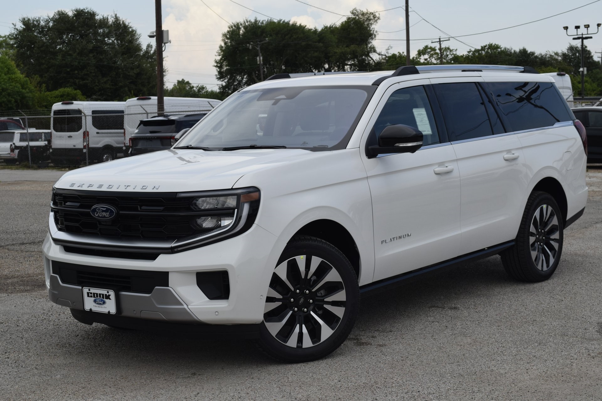 This 2025 Ford Expedition Max Platinum in Star White Metallic Tri-Coat comes with the following features: EcoBoost® 3.5L V6 GTDi DOHC 24V Twin Turbocharged 10-Speed Automatic 4WD Driver’s Package (Continuous Control Damping Suspension, Radio: B&O Unleashed Sound System by Bang & Olufsen, and SiriusXM w/360L), 10 Speakers, 2nd Row Power-Folding Captain’s Chairs, 3.73 Axle Ratio, 3rd Row seats: split-bench, 4-Wheel Disc Brakes, ABS brakes, Adjustable pedals, Air Conditioning, Alloy wheels, AM/FM radio: SiriusXM with 360L, Apple CarPlay/Android Auto, Auto High-beam Headlights, Auto-dimming door mirrors, Auto-dimming Rear-View mirror, Automatic temperature control, Brake assist, Bumpers: body-color, Compass, Delay-off headlights, Driver door bin, Driver vanity mirror, Dual front impact airbags, Dual front side impact airbags, Electronic Stability Control, Emergency communication system: 911 Assist, Exterior Parking Camera Rear, Four wheel independent suspension, Front anti-roll bar, Front Bucket Seats, Front Center Armrest, Front dual zone A/C, Front reading lights, Fully automatic headlights, Garage door transmitter, Genuine wood dashboard insert, Genuine wood door panel insert, Heated & Ventilated Leather Front Captain’s Chairs, Heated door mirrors, Heated Front Seats, Heated rear seats, Heated steering wheel, Illuminated entry, Leather steering wheel, Low tire pressure warning, Memory seat, Navigation System, Occupant sensing airbag, Outside temperature display, Overhead airbag, Overhead console, Panic alarm, Passenger door bin, Passenger vanity mirror, Pedal memory, Power door mirrors, Power driver seat, Power moonroof: Vista Roof, Power passenger seat, Power steering, Power windows, Radio data system, Radio: B&O Sound System by Bang & Olufsen, Rain sensing wipers, Rear air conditioning, Rear anti-roll bar, Rear reading lights, Rear window defroster, Rear window wiper, Reclining 3rd Row seat, Remote keyless entry, Security system, Speed control, Speed-sensing steering, Speed-Sensitive Wipers, Split folding rear seat, Spoiler, Steering wheel memory, Steering wheel mounted audio controls, Tachometer, Telescoping steering wheel, Tilt steering wheel, Traction control, Trip computer, Turn signal indicator mirrors, Variably intermittent wipers, Ventilated front seats, Voltmeter, and Wheels: 20″ Ebony Bright Machined Aluminum.