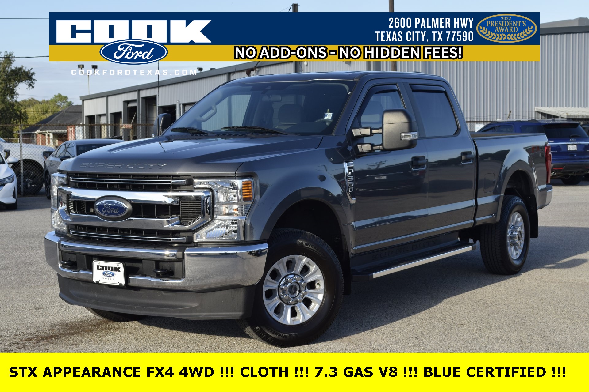 Certified. Carbonized Gray Metallic 2022 Ford F-350SD XL 4WD 10-Speed Automatic 7.3L V8 PFI SOHC 16V Federal 385hp 6″ Angular Bright Polished Step Bar, Advanced Security Pack, Bright Chrome Grille, Bright Chrome Hub Covers & Center Ornaments, Chrome Front Bumper, Chrome Rear Step Bumper, Cloth 40/20/40 Split Bench Seat, Electronic-Locking w/4.30 Axle Ratio, FX4 Off-Road Package, Hill Descent Control, Off-Road Specifically Tuned Shock Absorbers, Order Code 610A, Power Equipment Group, Power Front & Rear Seat Windows, Power Locks, Power Tailgate Lock, Remote Keyless Entry, Steering Wheel-Mounted Cruise Control, STX Appearance Package, Trailer Tow Mirrors w/Power Heated Glass, Unique FX4 Off-Road Box Decal, Wheels: 18″ Sparkle Silver Painted Cast Aluminum.