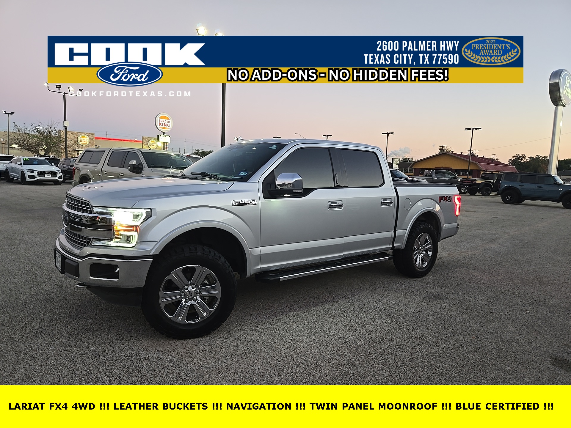 Certified. Ingot Silver 2018 Ford F-150 LARIAT 4WD 10-Speed Automatic 5.0L V8 110V/400W Outlet, 2nd Row Heated Seats, 4×4 FX4 Off-Road Bodyside Decal, Automatic High Beam w/Rain-Sensing Wipers, BLIS Blind Spot Information System, Class IV Trailer Hitch Receiver, Electronic Locking w/3.31 Axle Ratio, Equipment Group 502A Luxury, Extended Range 36 Gallon Fuel Tank, FX4 Off-Road Package, GVWR: 7,050 lbs Payload Package, Heated Steering Wheel, Higher-Capacity Radiator, Higher-Power Cooling Fans, Hill Descent Control, LARIAT Chrome Appearance Package, Leather-Trimmed Bucket Seats, LED Sideview Mirror Spotlights, Navigation System, Off-Road Tuned Front Shock Absorbers, Power Glass Sideview Mirr w/Chrome Skull Caps, Power Tilt/Telescoping Steering Column w/Memory, Pro Trailer Backup Assist, Quad Beam LED Headlamps & LED Taillamps/Fog Lamps, Radio: B&O Play Premium Audio System, Remote Start System w/Remote Tailgate Release, Reverse Sensing System, SYNC® Connect, Tailgate Step w/Tailgate Lift Assist, Trailer Tow Package, Twin Panel Moonroof, Universal Garage Door Opener, Upgraded Front Stabilizer Bar, Voice-Activated Touchscreen Navigation System, Wheels: 20″ Chrome-Like PVD, Windshield Wiper De-Icer.