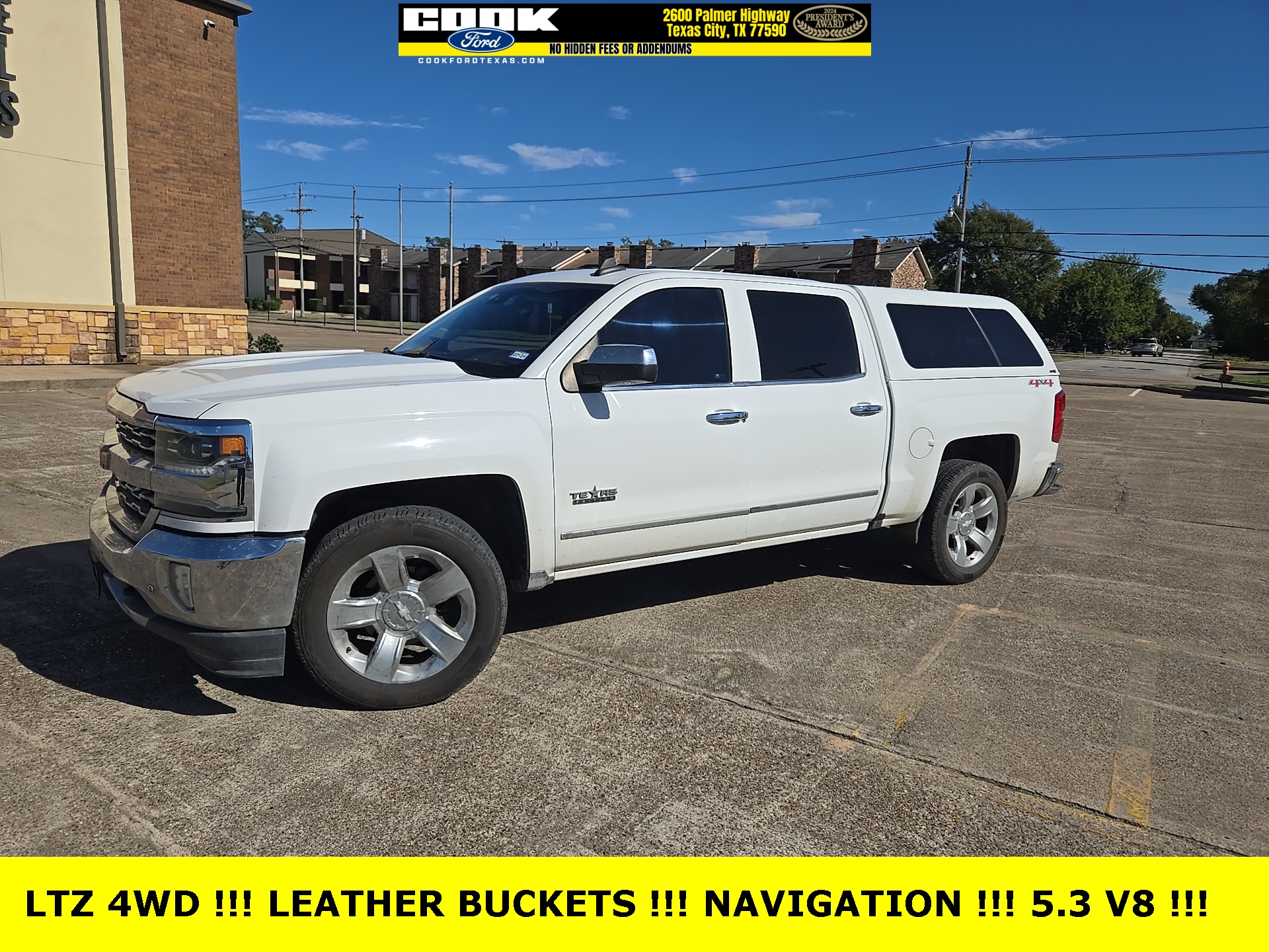 Summit White 2017 Chevrolet Silverado 1500 LTZ 1LZ 4WD 6-Speed Automatic Electronic with Overdrive EcoTec3 5.3L V8 110-Volt AC Power Outlet, 150 Amp Alternator, 4.2″ Diagonal Color Display Driver Info Center, 6 Speaker Audio System, Auto-Dimming Inside Rear-View Mirror, Auxiliary External Transmission Oil Cooler, Bluetooth® For Phone, Chrome Bodyside Moldings, Chrome Cap Power-Adjustable Heated Outside Mirrors, Chrome Door Handles, Chrome Grille Surround, Chrome Mirror Caps, Color-Keyed Carpeting w/Rubberized Vinyl Floor Mats, Deep-Tinted Glass, Driver & Front Passenger Illuminated Vanity Mirrors, Dual-Zone Automatic Climate Control, Enhanced Driver Alert Package, EZ Lift & Lower Tailgate, Forward Collision Alert, Front Chrome Bumper, Front Frame-Mounted Black Recovery Hooks, HD Radio, Heavy-Duty Rear Locking Differential, IntelliBeam Automatic High Beam On/Off Headlight, Lane Keep Assist, Leather Wrapped Heated Steering Wheel, Leather Wrapped Steering Wheel w/Cruise Controls, LED Taillamps w/Signature, Low Speed Forward Automatic Braking, LTZ Plus Package, Manual Tilt/Telescoping Steering Column, Navigation System, OnStar 3 Months Guidance Plan, OnStar w/4G LTE, Power Adjustable Pedals, Power Sliding Rear Window, Power Windows w/Driver Express Up, Preferred Equipment Group 1LZ, Rear 60/40 Folding Bench Seat (Folds Up), Rear Chrome Bumper, Rear Vision Camera, Rear Wheelhouse Liners, Remote Keyless Entry, Remote Locking Tailgate, Remote Vehicle Starter System, Single Slot CD/MP3 Player, Steering Wheel Audio Controls, Texas Edition, Texas Edition Badging, Theft Deterrent System (Unauthorized Entry), Thin Profile LED Fog Lamps, Trailering Package, Ultrasonic Front & Rear Park Assist, Universal Home Remote, Wheels: 20″ x 9″ Chrome.